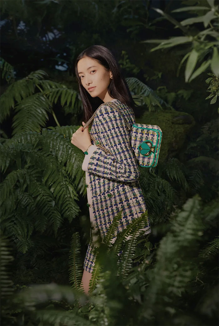 一向气质都在线的cici选择了黑灰色格纹粗花呢套装,搭配同色系的包包。没有过多的配饰,简单翠绿色宝石手链和服饰上的绿色扣子形成呼应,自然又大气。
