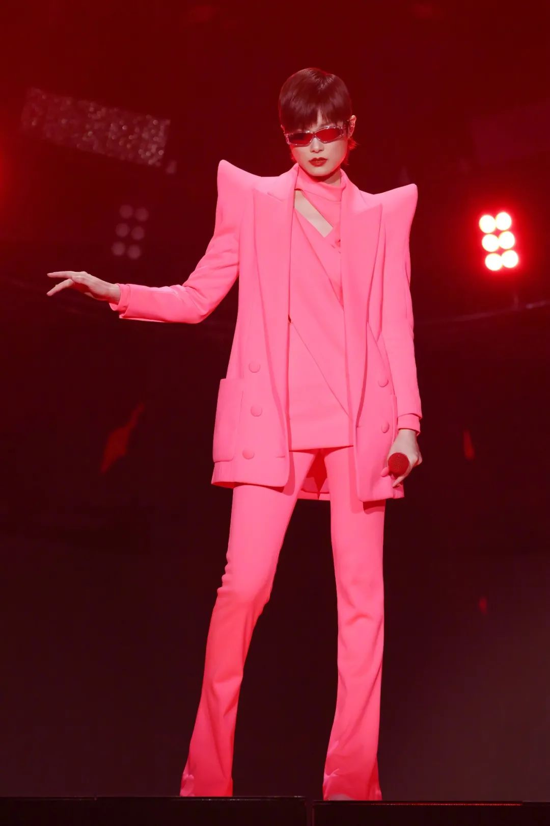 李宇春在今年微博之夜上也是全套的艳粉色,一身Balmain 2021春夏系列荧光粉西装体现“无价之姐”的自信姿态。廓形垫肩设计、强烈的高饱和度色彩异常夺目,还省去了搭配的烦恼。