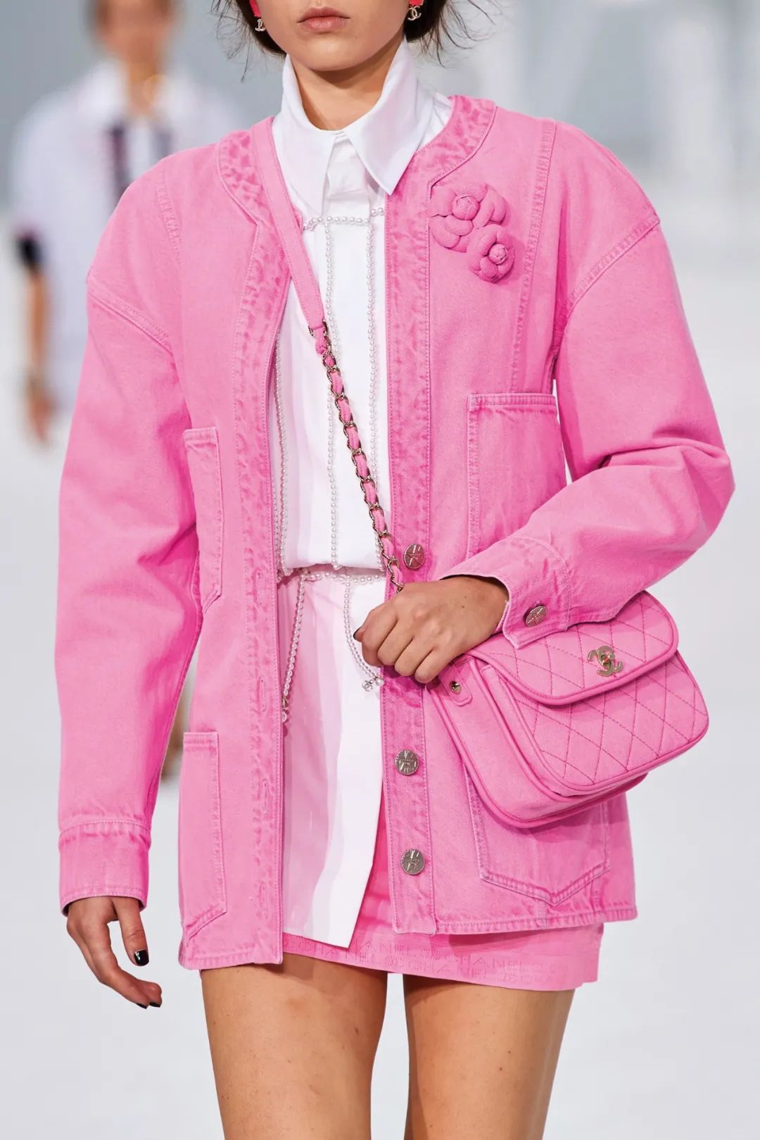 但也不一定全是小清新,CHANEL秀场上用牛仔面料做成了荧光粉套装。