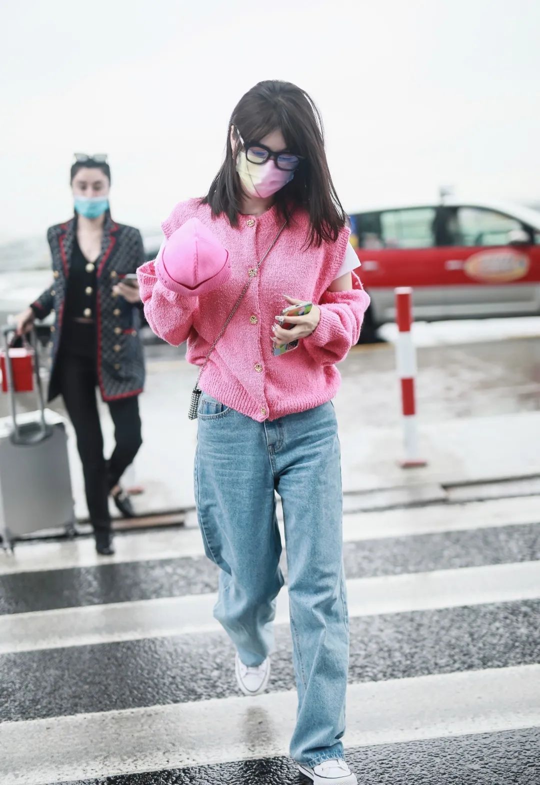 粉和蓝色是经典的组合,搭配在一起真的很少女。李菲儿粉色毛衣外套的造型令人眼前一亮,搭配牛仔裤、帆布鞋,最适合还有丝丝凉意的春天。这件针织外套的袖子也是可拆卸的,卸掉就变成了无袖针织衫。