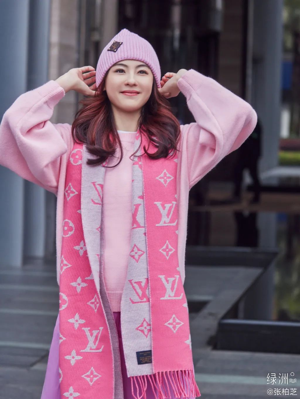 张柏芝另一套写真再次上演逆龄少女风,All pink造型清丽可人,粉嫩卫衣搭配紫粉阔腿裤,头戴粉色针织帽,还有Louis Vuitton粉色长围巾加持。同色系搭配yyds,春天温暖和煦的感觉迎面而来。