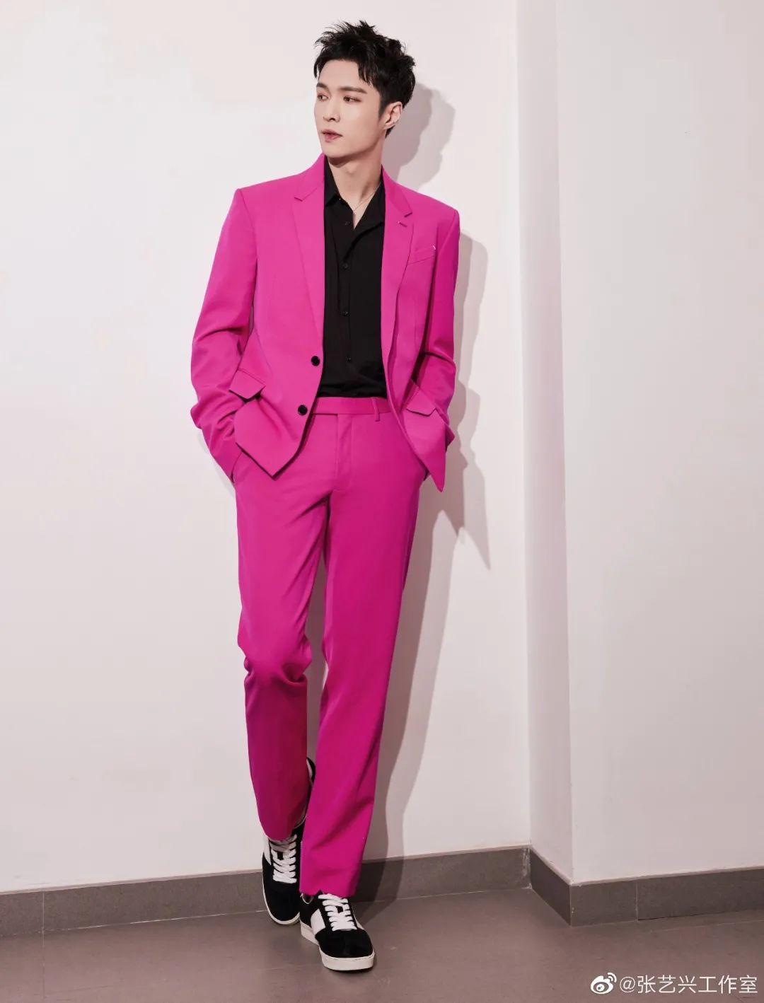张艺兴用一套艳粉色的西装套装内搭黑色衬衫,脚下还有黑白板鞋做搭配,能驾驭那么浓艳的高饱和度套装,张艺兴了不起。