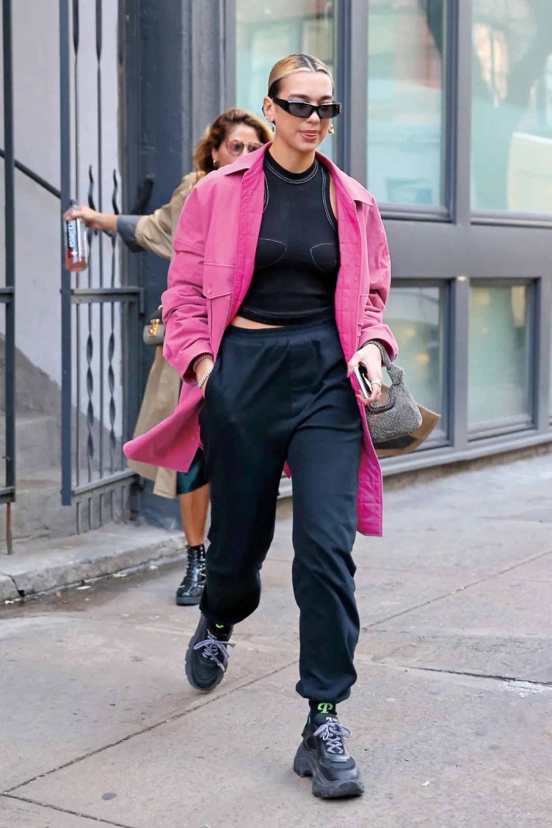 Dua Lipa用荧光粉和黑色可以维持一如既往的酷girl形象,你只要挑一件粉色外套来配合你的黑色套装就可以轻易完成。