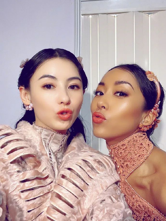 李斯丹妮这套造型的颜色其实有点粉紫红傻傻分不清楚,美就完事了。