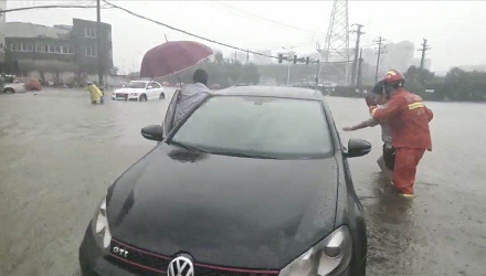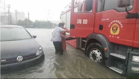 中队指挥员立即命令驾驶员将消防车开到受困车辆旁,车内共有一男一女两名被困人员,并将被困人员转移到车上。据了解,该名男子原本是要前往单位上班,受台风天气影响,半路发现道路已经有积水,抱着侥幸心理,就在车辆行驶至龙江路与永强路交叉口时车子突然熄火,车内男子立即拨打119等待救援。