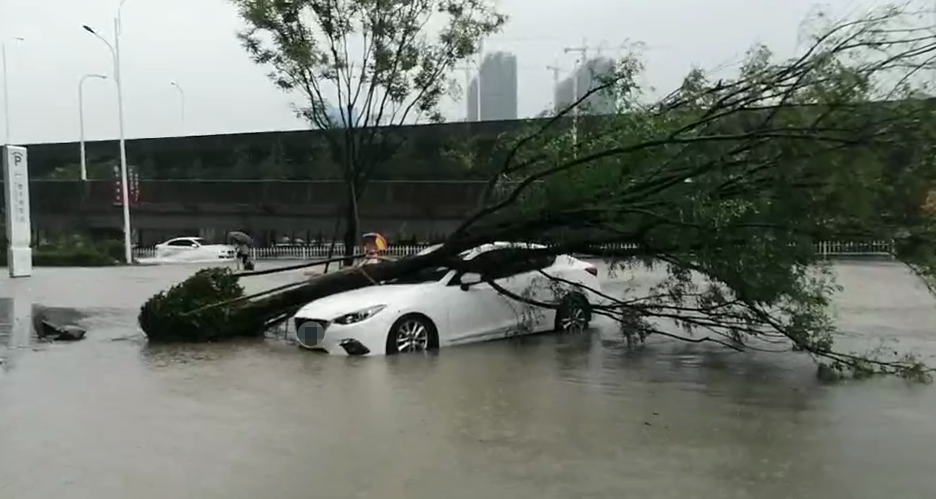 有车辆被倒下的树木砸中