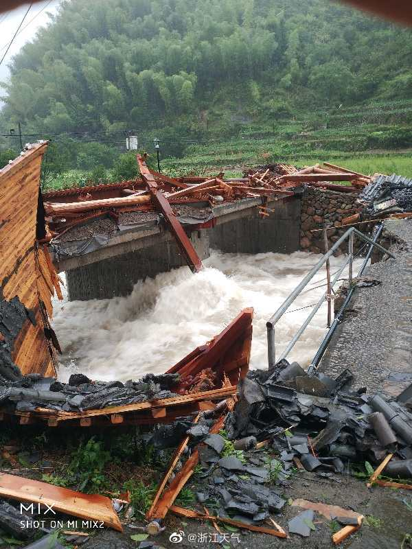 受“黑格比”影响,台州市黄岩区上郑乡垟头庄村黄岩山景区廊桥被刮倒,溪水暴涨。