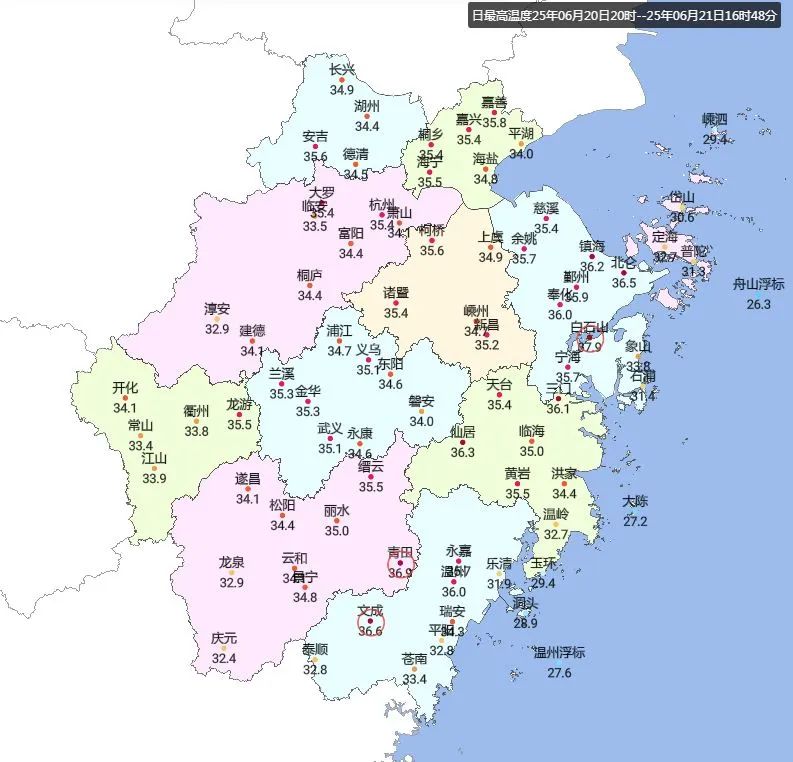 此外,天气炎热,尤其是浙中南地区,预计今天白天的最高气温在33-35℃,配合较高的湿度,体感较为闷热。