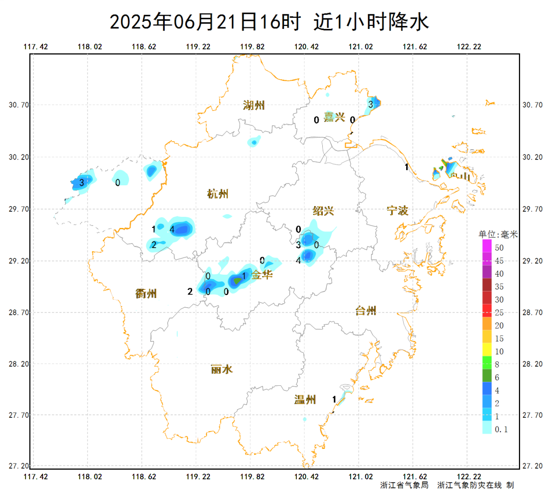 此外,其它地区以分散性雷阵雨为主,16时,近1小时累计雨量最大出现在金华市婺城区安地站,为15.9毫米。
