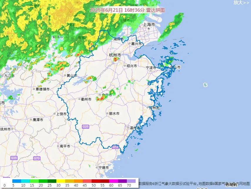 今天浙北和浙中西部要注意防范强降水,部分中到大雨,局部暴雨到大暴雨。而其它地区更多的是要防范午后分散性雷阵雨,由于热力条件较好,雷阵雨的强度也不小,局地暴雨,个别大暴雨。