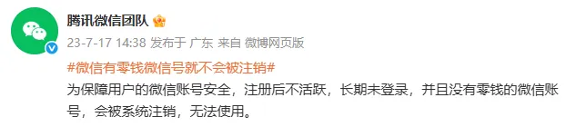 2023年7月17日,腾讯微信团队曾表示微信有零钱的微信号就不会被注销,“为保障用户的微信账号安全,注册后不活跃,长期未登录,并且没有零钱的微信账号,会被系统注销,无法使用”。