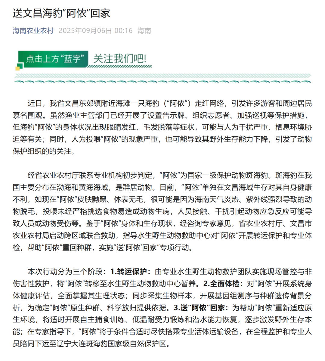 9月6日,海南省农业农村厅发文:近日,我省文昌东郊镇附近海滩一只海豹(“阿侬”)走红网络,引发许多游客和周边居民慕名围观。虽然渔业主管部门已经开展了设置告示牌、组织志愿者、加强巡视等保护措施,但海豹“阿侬”的身体状况出现眼睛发红、毛发脱落等症状,可能与人为干扰严重、栖息环境胁迫等有关;同时,人为投喂“阿侬”的现象严重,也可能导致其野外生存能力下降,引发了动物保护组织的关注。