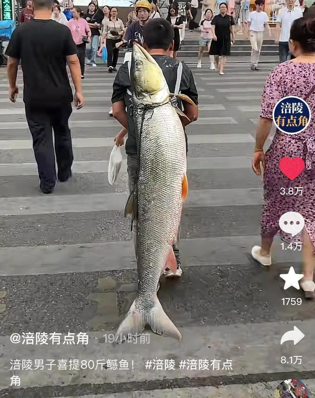 男子钓上79斤大鱼,背着在街上显摆20多分钟,当事人:有人想出1000元买,自己没卖