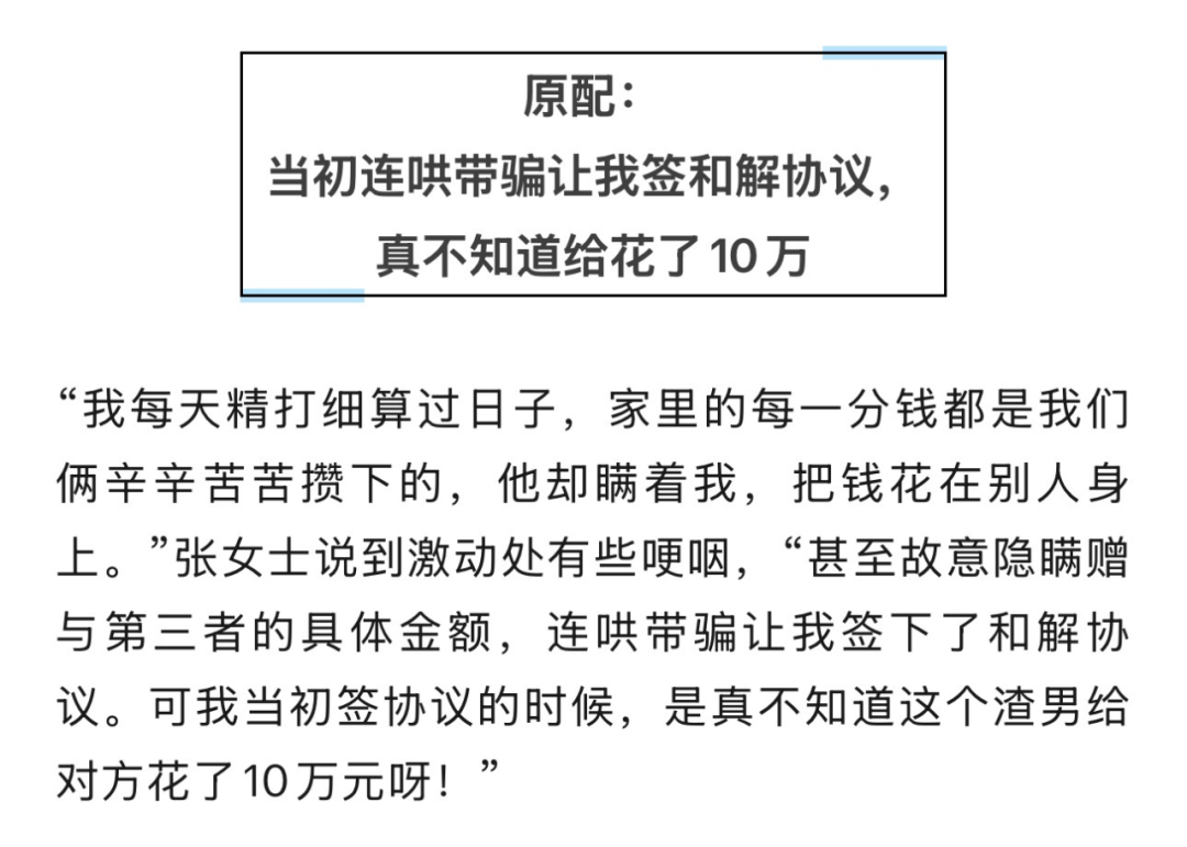 “这一年时间,我丈夫给她花的钱有10万元,他们当初骗我,让我草草签了和解协议。”张女士越想越来气。