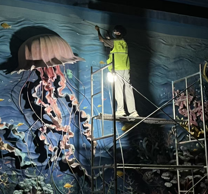 一条以“麋鹿”为主题的高浮雕视频在平台获得超百万播放量,成功破圈,也让更多人了解到,浮雕壁画不只是涂个腻子就可以的,而是有画线条初稿、电焊造型、安装电焊骨架、搅拌腻子、做背景浮雕、做主体造型、处理毛边、细节刻画、打磨上色等多个复杂步骤的专业工艺。