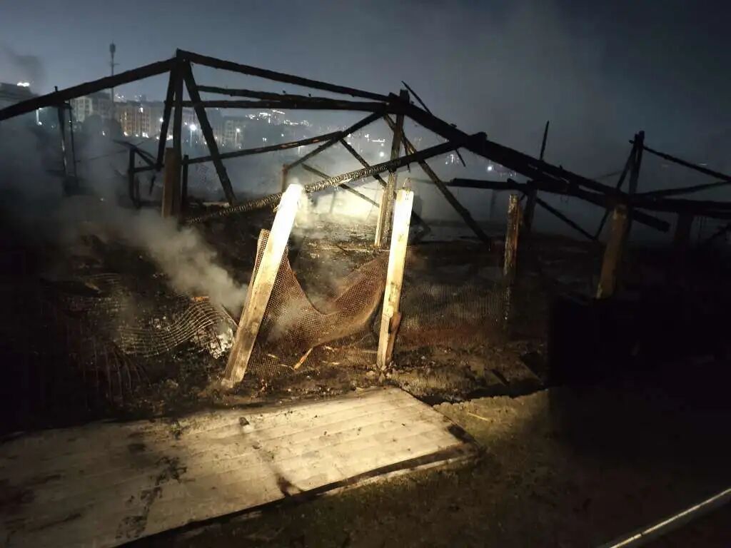 经过紧张有序地处置,火势被完全扑灭,此次火灾造成大棚内300余只鸭子死亡。