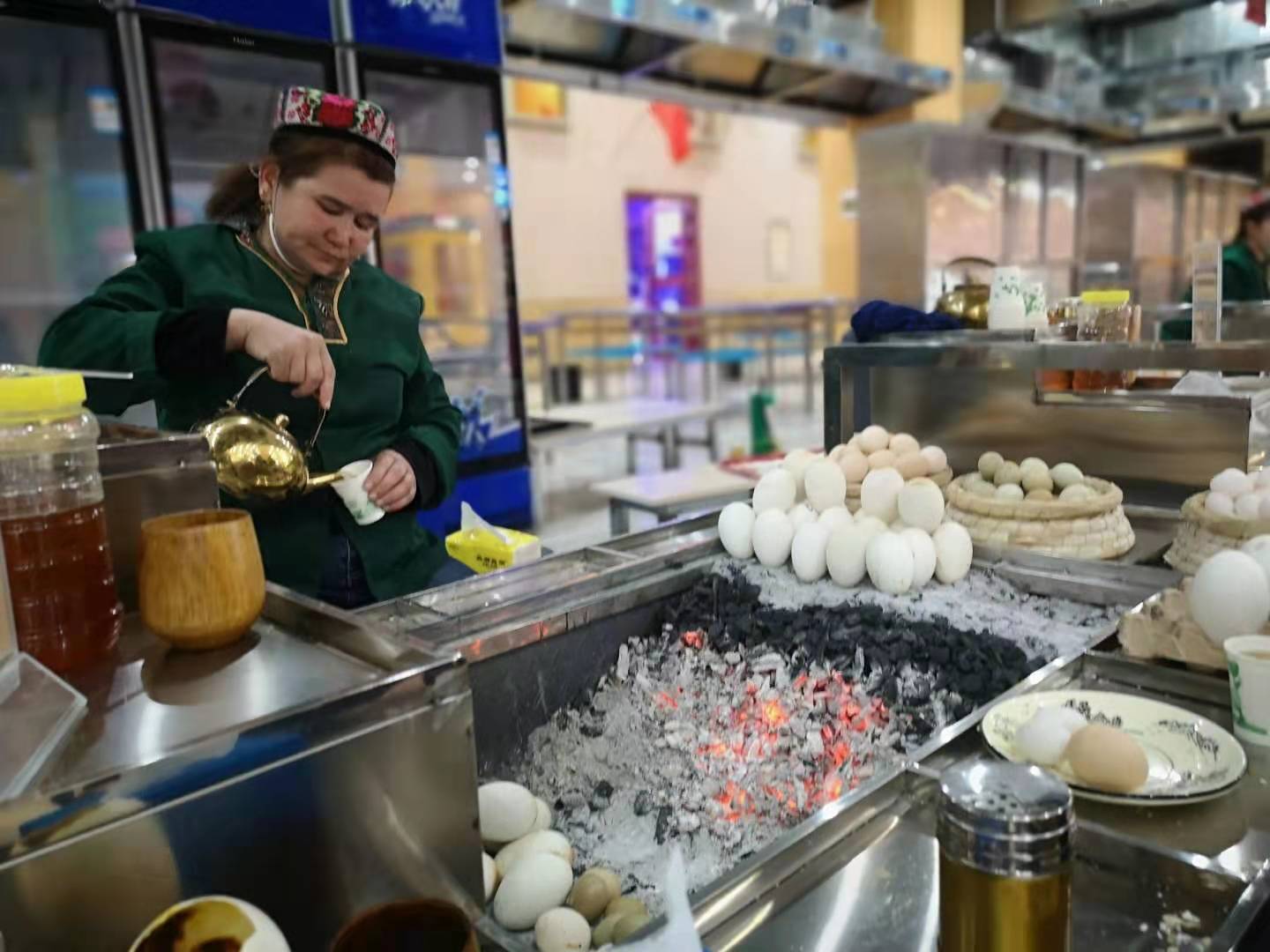 在和田,还有一种不能错过的美食就是烤蛋,恐怕你只能在新疆见到这种方式烹制蛋制品。小的是鹌鹑蛋、鸽子蛋;中等的是鸡蛋、鸭蛋;大的是鹅蛋;特大号的是鸵鸟蛋,您要尝尝哪一种呢?大到鹅蛋,小到鸽子蛋,都可以放在炭火和炭灰上慢慢地烤熟,烤蛋与煮蛋不同,剥开后,蛋清细腻紧实,犹如羊脂玉,吃到嘴里很有嚼劲,而蛋黄则有股淡淡的焦香。