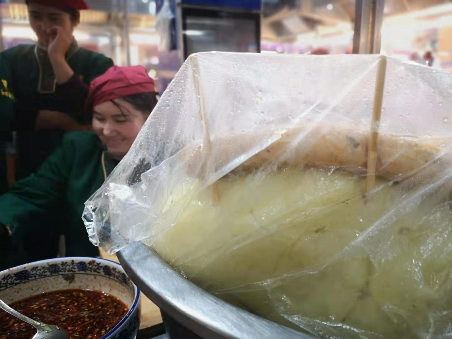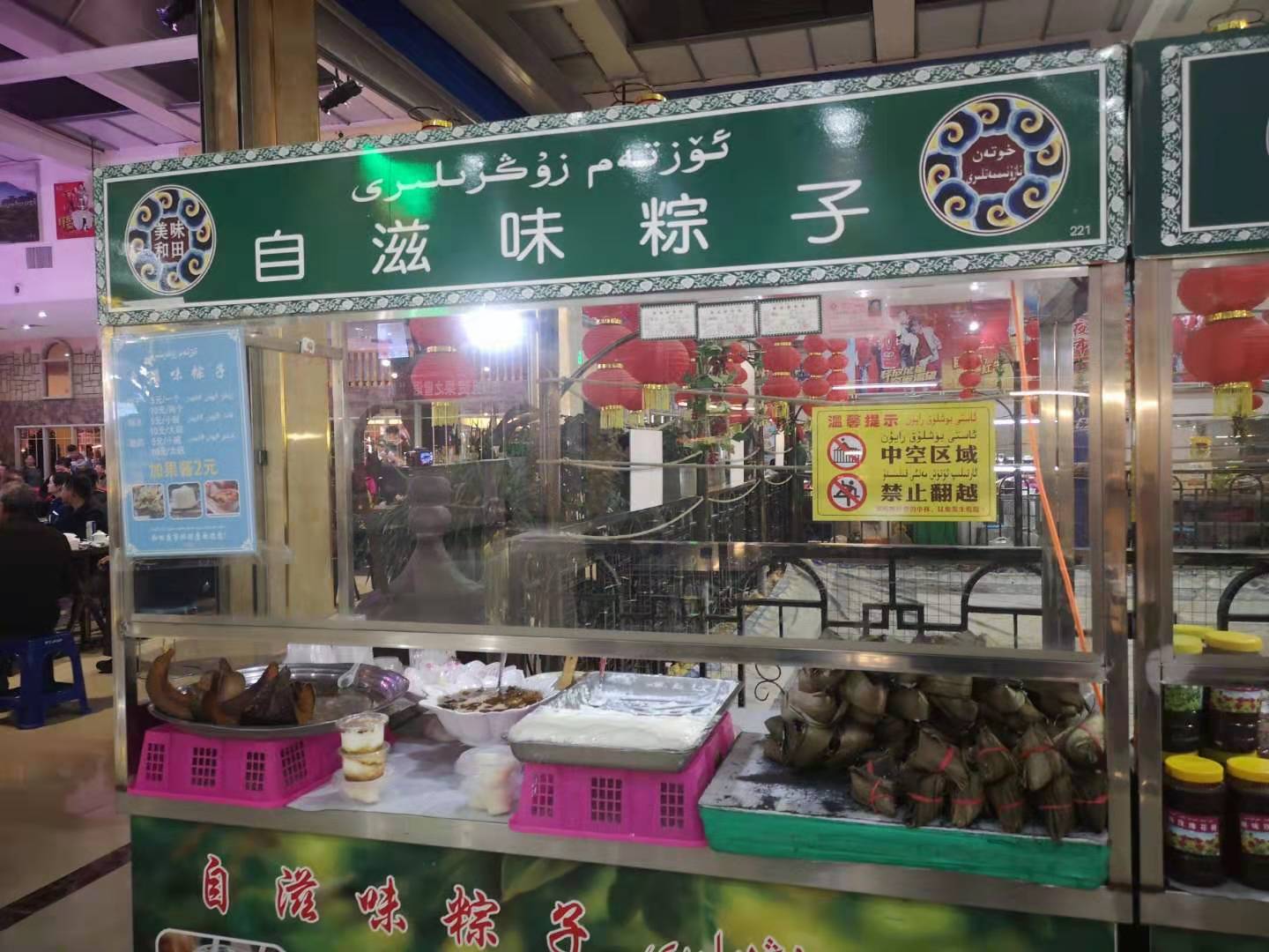 在夜市的摊位上,还有一种大家很熟悉的食物——粽子。粽子本来是汉族的传统美食,到了新疆夜市,维吾尔族的朋友对它进行了改良。吃之前用工具压扁,再淋上酸奶、糖稀、蜂蜜、木瓜酱、无花果酱等等,多种食材合在一起吃,当地人还给它取了个好听的名字叫做“民族大团结”。