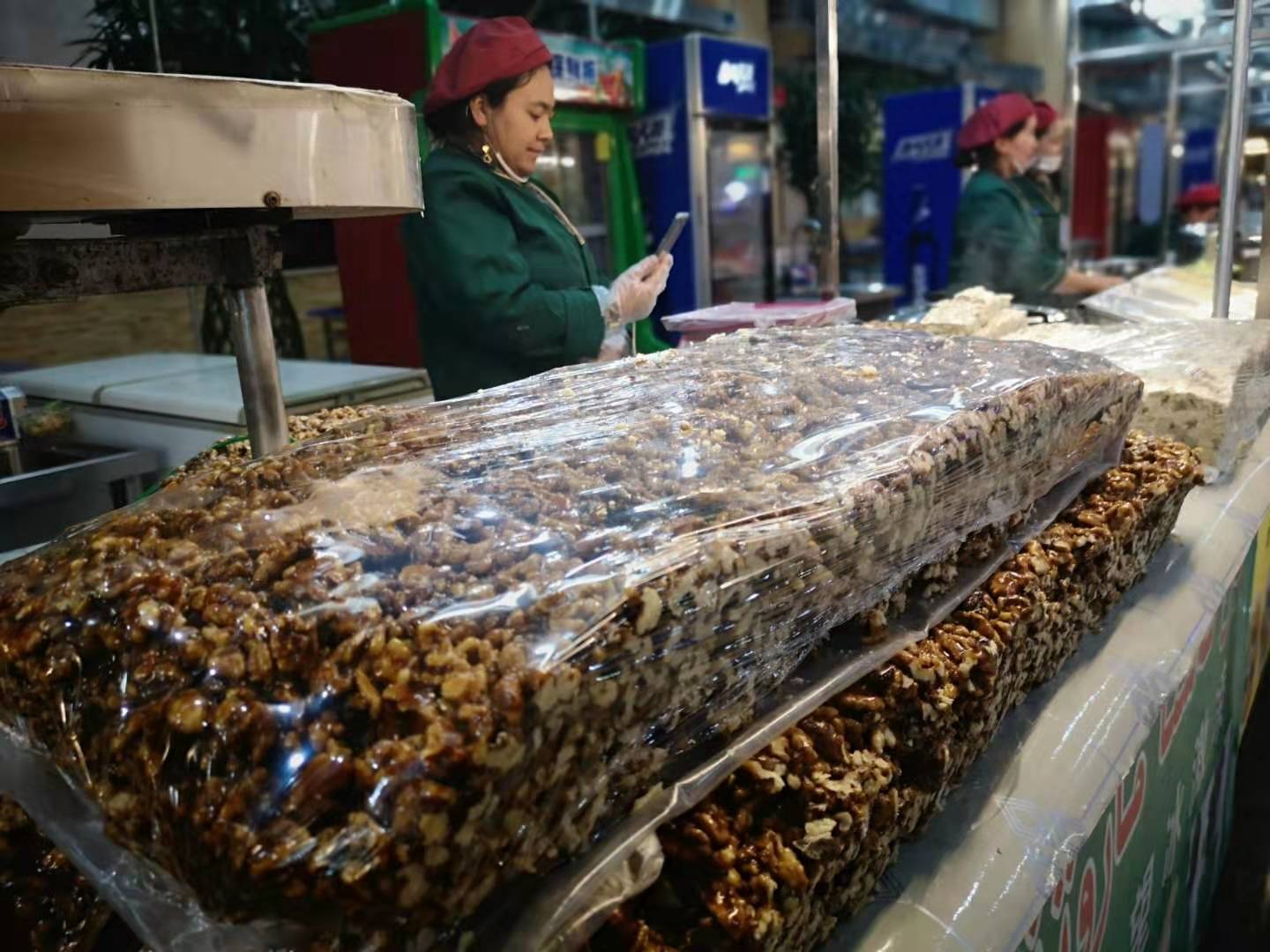 刚一步入夜市,环环瞬间就被琳琅满目的民族特色美食所吸引。 新疆特色美食 “切糕”,用葡萄糖浆、核桃、葡萄干等原料制作而成,吃一口甜在心。新疆夜市有名的肚包肉,也是游客必尝的美食。它是用羊胃包着羊肉、羊杂碎及配料烹煮而成,吃一口香味扑鼻。