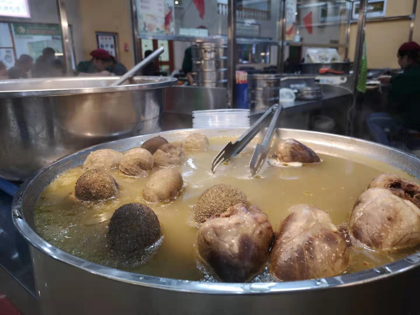 下面要介绍的新疆特色小吃估计很多人不认识,叫“面肺子”。做法有些复杂,简单说就是把羊肝等内脏切成小粒,加调料及洗净的大米搅拌均匀,然后塞入羊肺和羊肠中,再经过一系列复杂的蒸煮,就成了现在看到的样子。至于味道么,你尝了就知道。