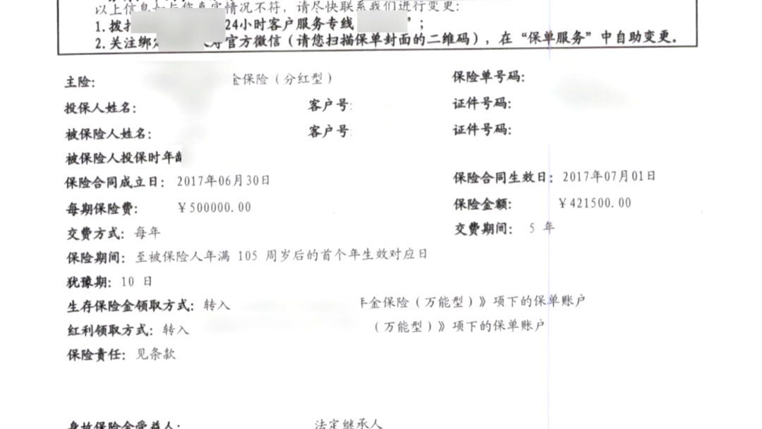 合同里明确写着,1000万元本金要等到李先生年满105周岁才能支取,五年后只能每年领取少量红利。
