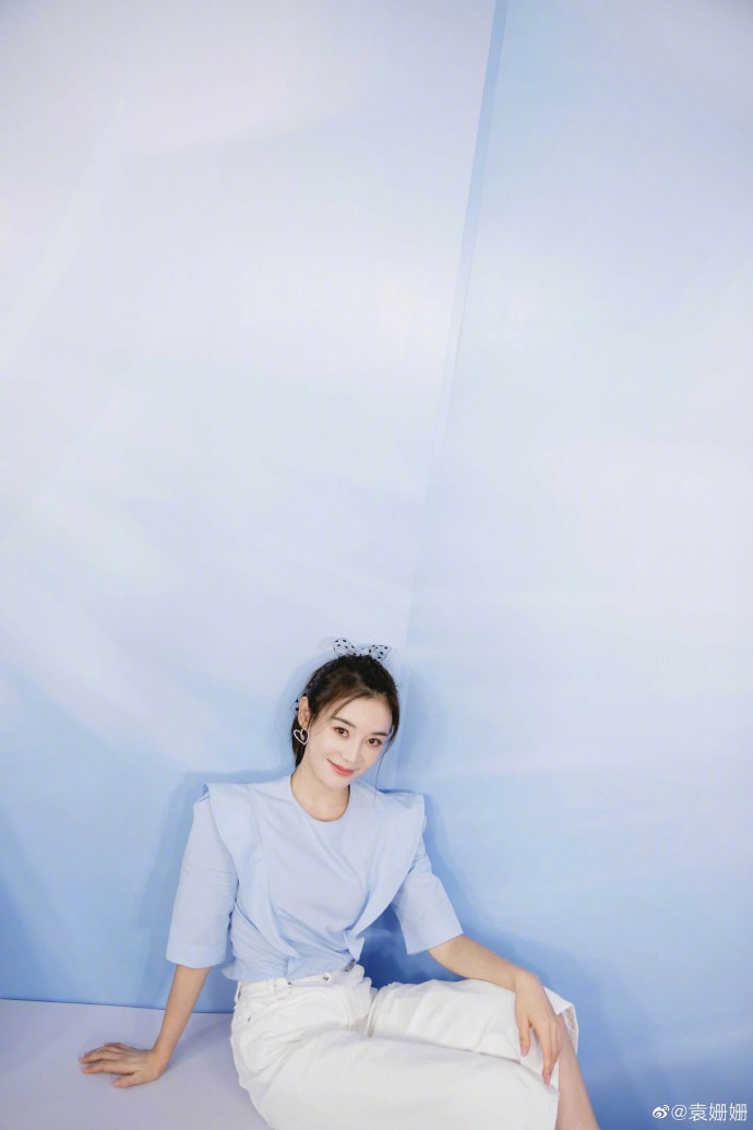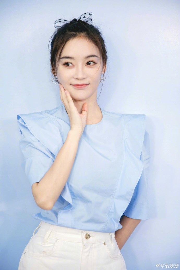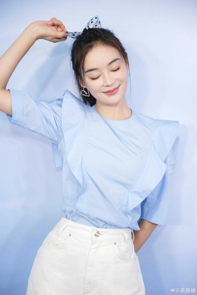 近日,袁姗姗在微博发一组休闲照。照片中她梳马尾辫,用蕾丝蝴蝶结作为装饰,身穿褶皱设计感的浅蓝色上衣搭配白色休闲裤,十分清纯。她在浅蓝色背景前做出扯蝴蝶结、仰头微笑、摸脸的动作,表情俏皮。