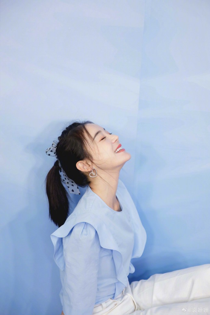 袁姗姗穿浅蓝色上衣清纯俏皮 梳马尾辫温柔甜笑可人