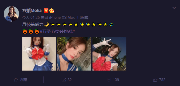 近日,方媛在微博分享万圣节造型,晒出cos美少女战士的照片。照片中方媛穿美少女制服青春靓丽,扎双马尾刘海从额头两边垂下,配上妆容神似美少女战士。