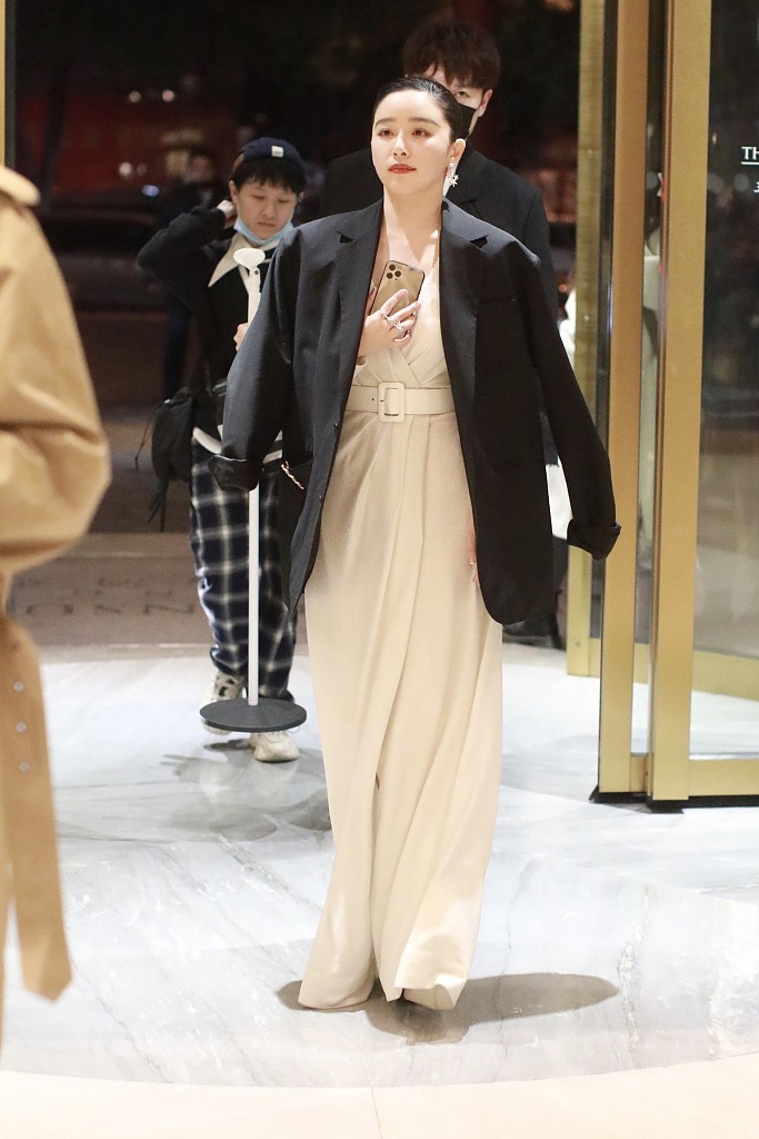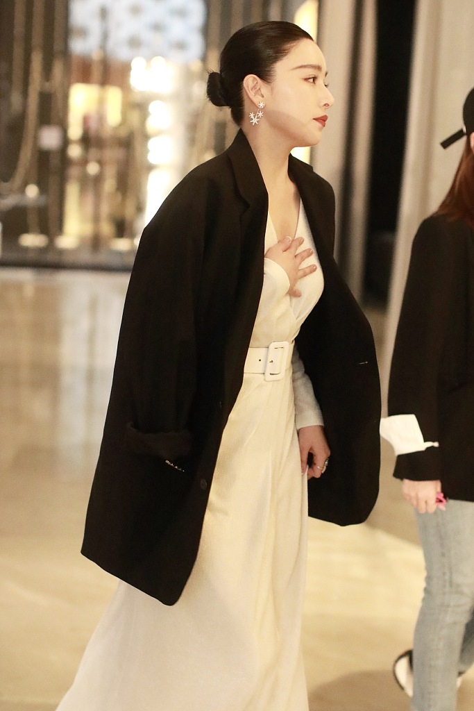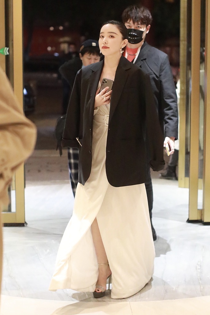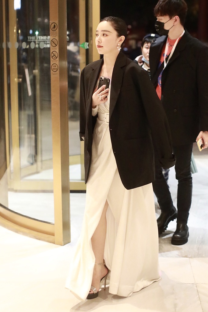 近日,阚清子现身某酒店,她身穿白色礼服披着黑西装外套御寒,用手捂着胸口,油头造型知性成熟。