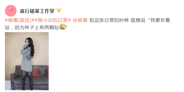 近日,工作室更新一张杨幂的日常照,照片中杨幂穿格子长衬衫裙,搭配黑色高筒靴,背对镜头转身用手捂嘴。工作室透露杨幂这样拍照的小心思,“拍这张日常的时候,狐狸说‘我要反着站,因为袜子上有两颗钻。’”