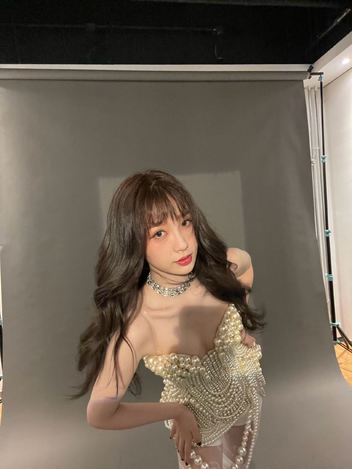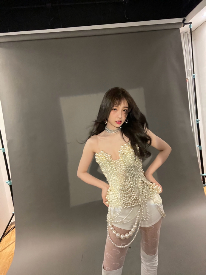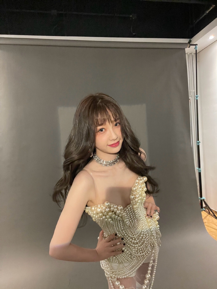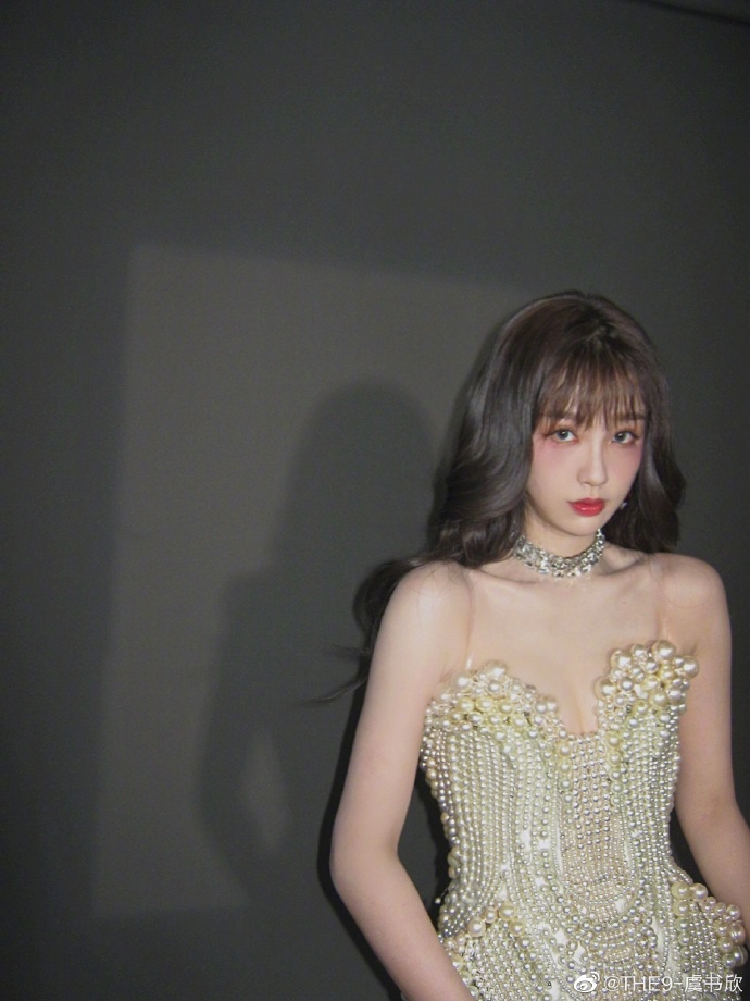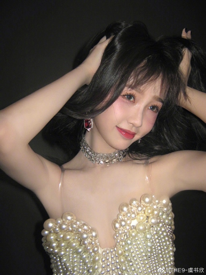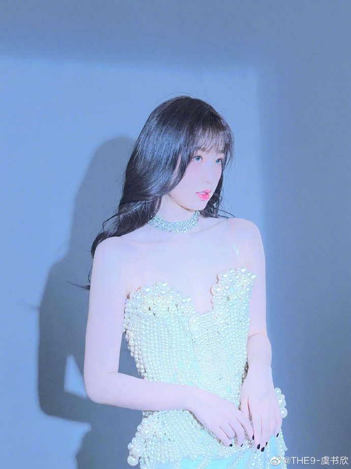 近日,虞书欣分享造型图,她身穿珍珠抹胸上衣秀香肩,对镜掐腰搞怪,十分俏皮可爱。