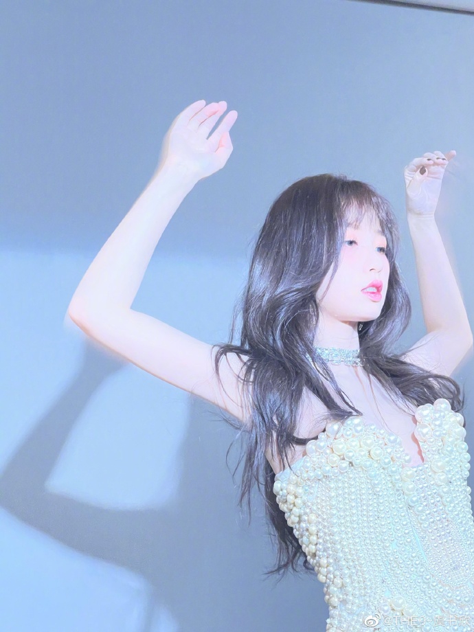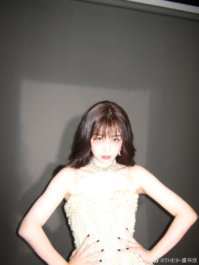 虞书欣穿珍珠抹胸上衣秀香肩 对镜掐腰搞怪俏皮可爱