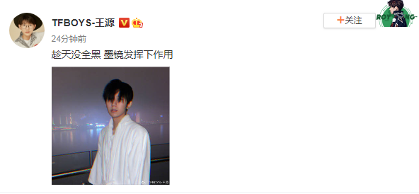 近日,王源刘海被看成墨镜的错位图被网友调侃,15日晚王源再玩自己的“墨镜错位”梗,长刘海遮住双眼拍照,配文:“趁天没全黑,墨镜发挥下作用。”