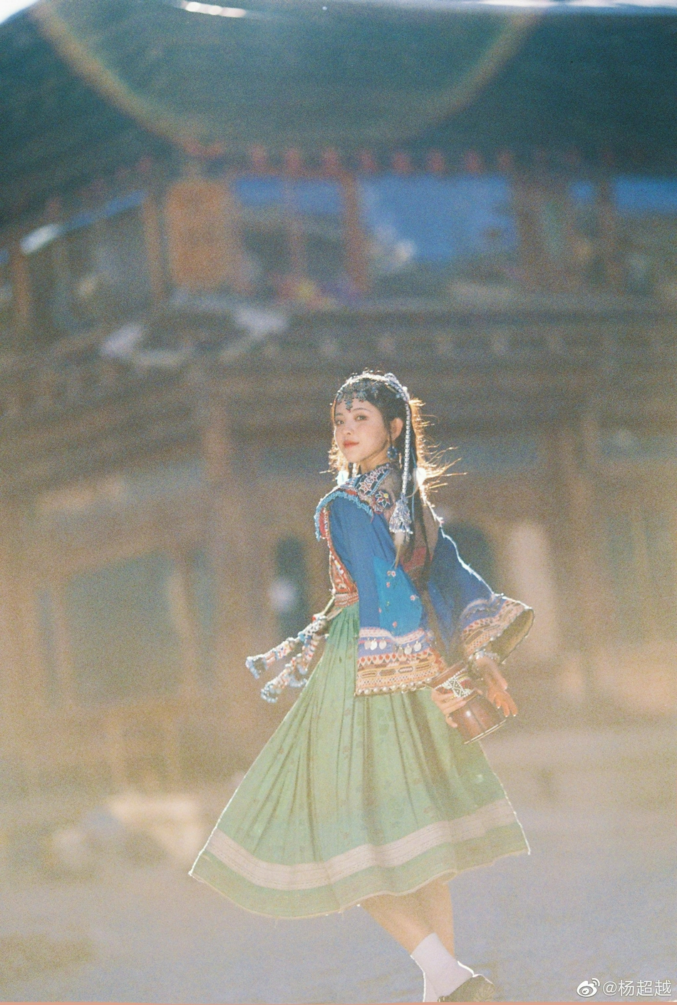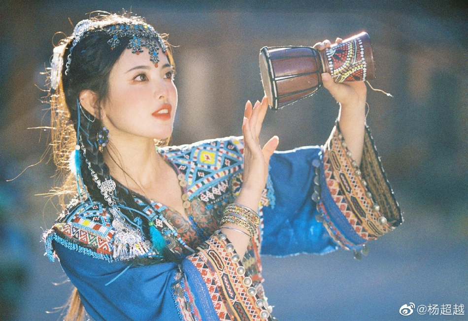 近日,杨超越在微博曝光一组最新的民族风写真,图中的杨超越身着蓝色民族服饰,妆发精致,神色俏皮灵动。