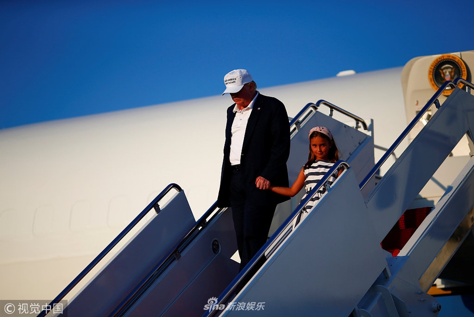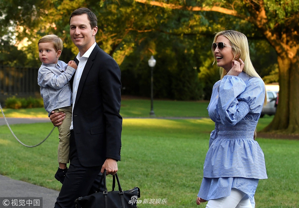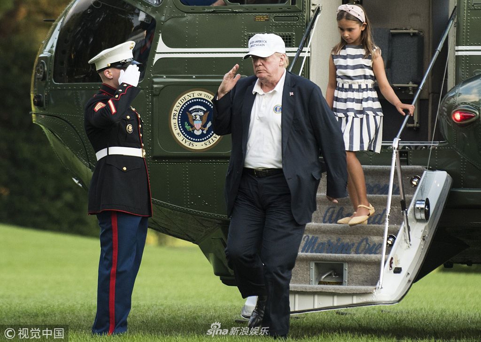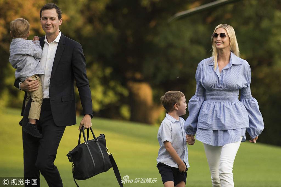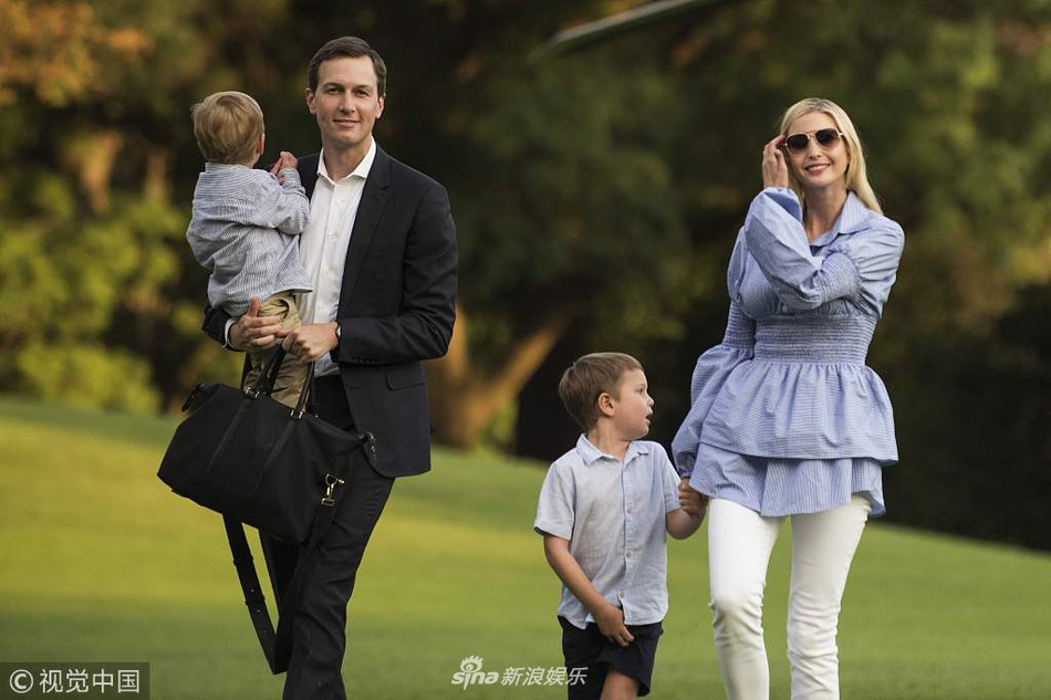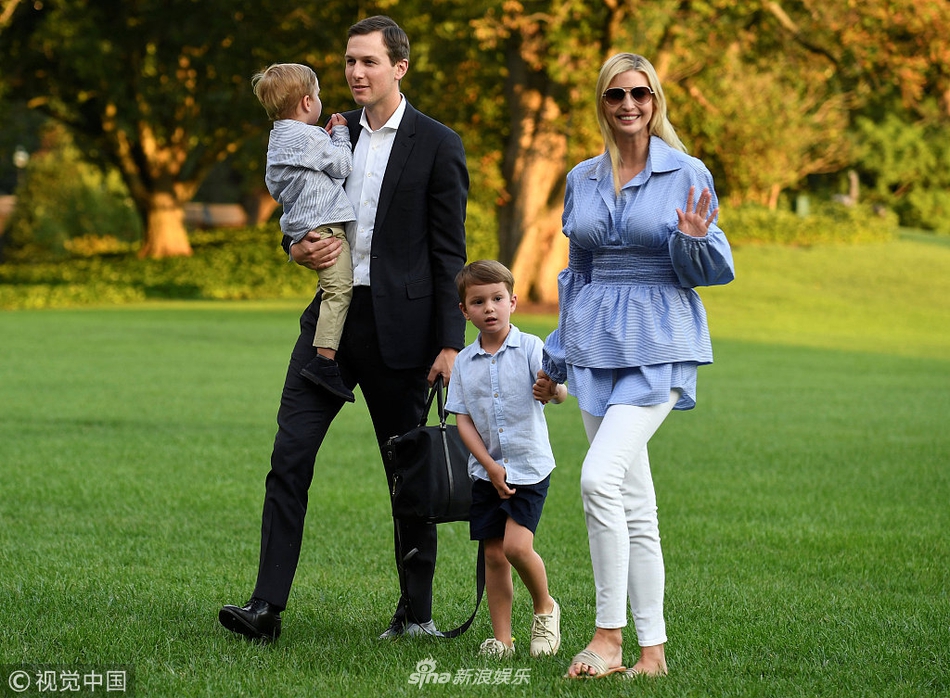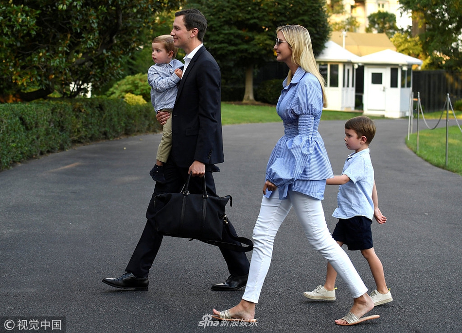 当地时间2018年7月29日,美国总统特朗普和爱女伊万卡·特朗普一家五口从新泽西州度周末归来。特朗普手牵外孙女Arabella。伊万卡和丈夫一人照顾一个孩子。