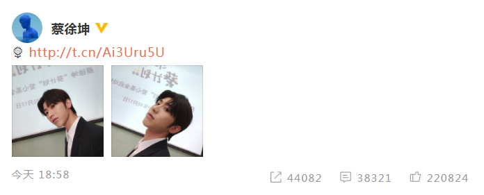 10月17日,蔡徐坤在绿洲晒出自拍照,并配了一个向日葵的表情。照片中,蔡徐坤身穿白色衬衣搭配黑色西装,晒出棱角分明的侧脸,十分帅气。