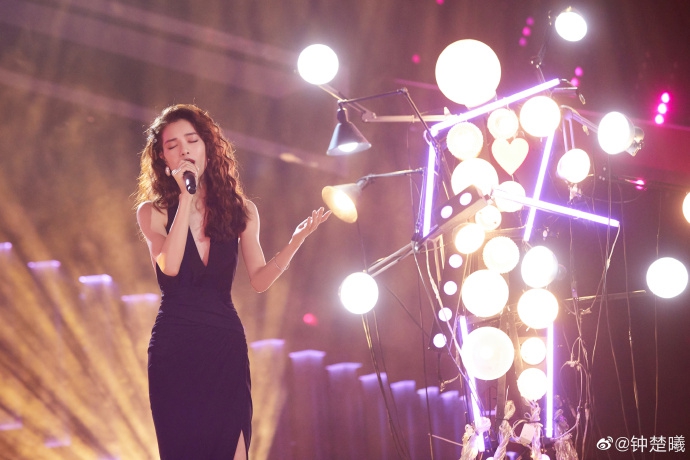 钟楚曦穿深v开叉长裙性感妩媚 红唇卷发演绎复古风情