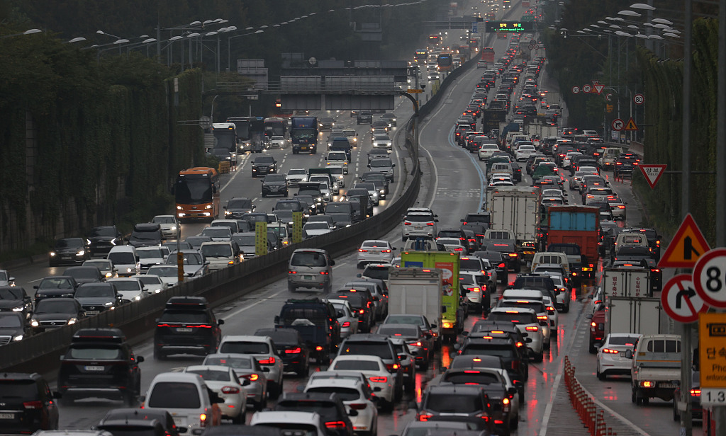 当地时间2021年10月8日,韩国首尔,当地交通出现拥堵现象。10月9日是韩文日,是韩国纪念世宗大王创制韩文的日子,目的在于鼓励研究和普及韩文。