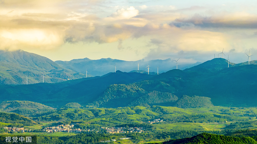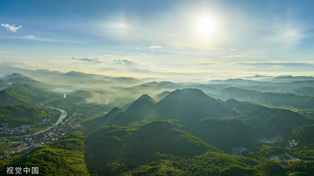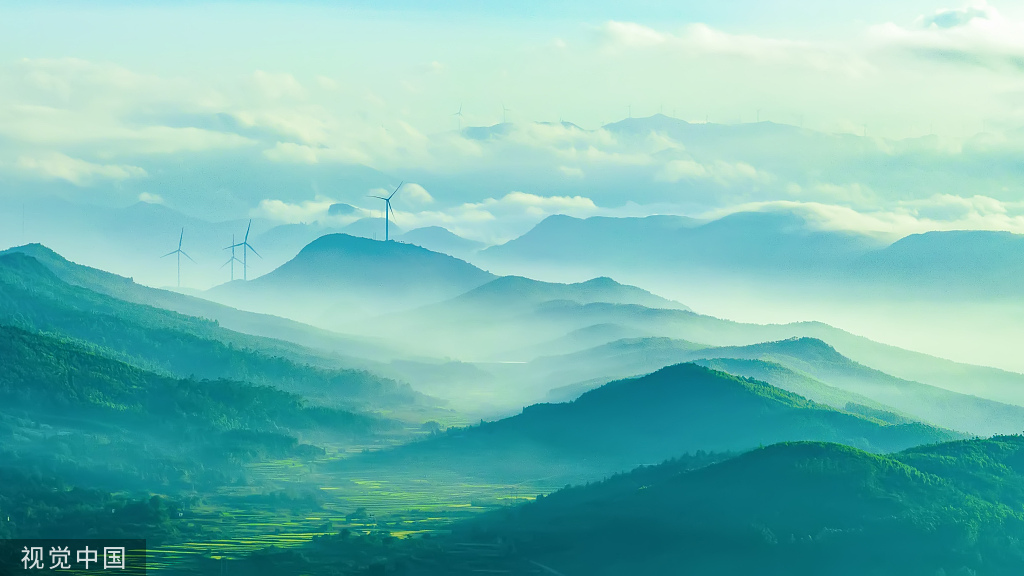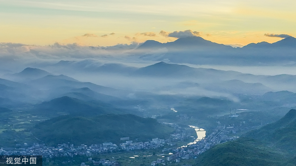 2022年8月6日清晨,湖南郴州,临武县青山连绵,山脉在晨光与薄雾的映衬之下若隐若现,色彩鲜明,宛如仙境。