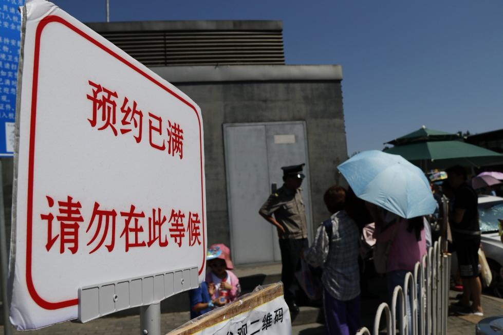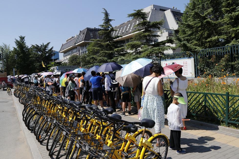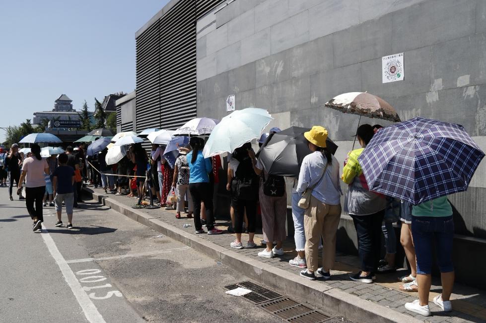 当天北京烈日当头,天气炎热,大批游客依然顶烈日在校门口等候。