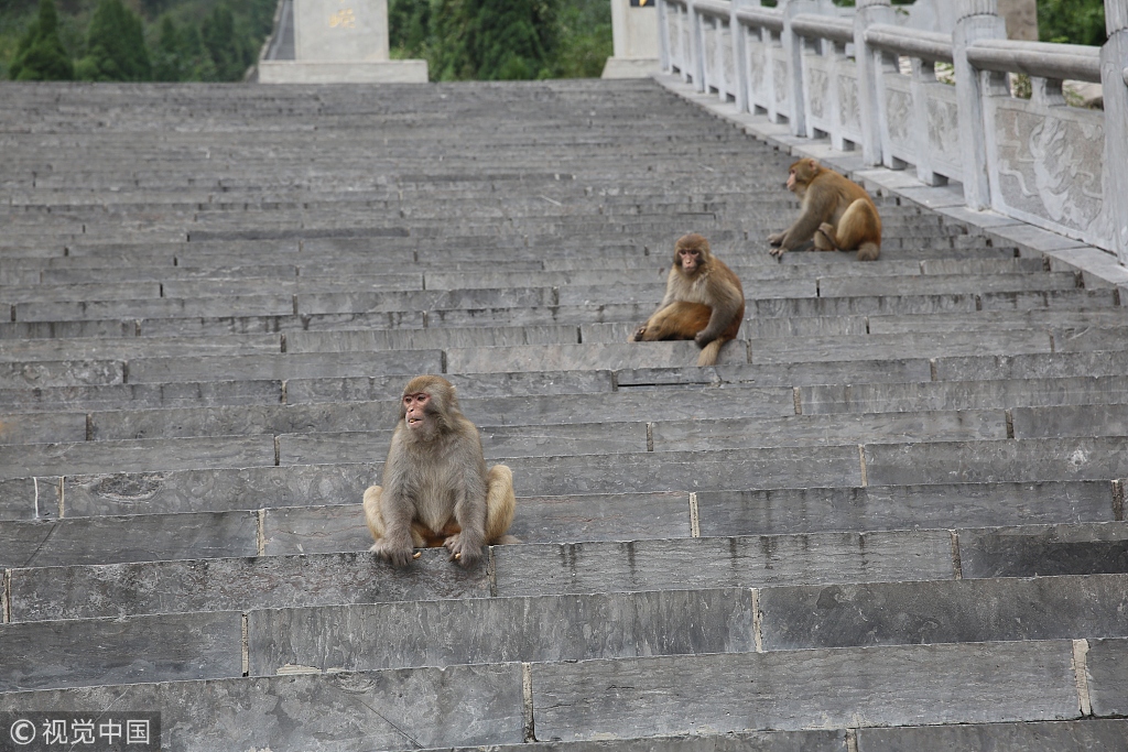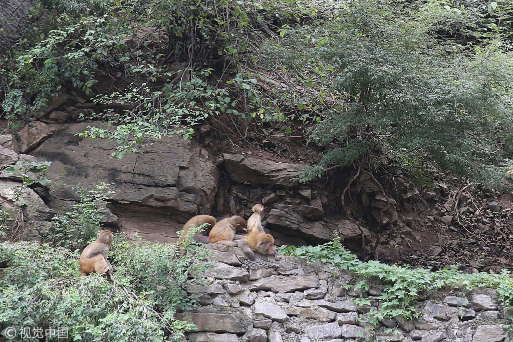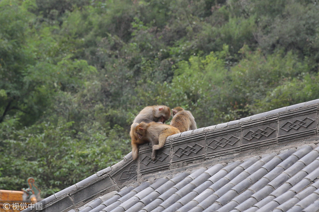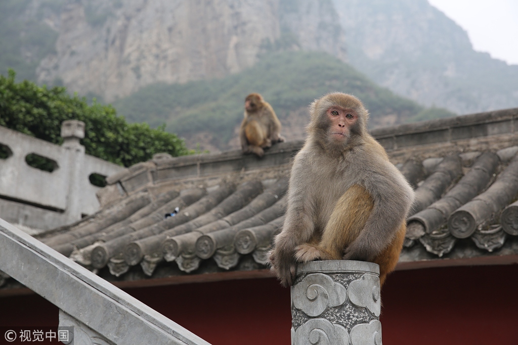 2018年9月14日,河南济源,五龙口风景名胜区内自然繁殖的3000多只猕猴,时而坐卧房顶,时儿穿梭在景区检拾食物,神态怡然自得。五龙口目前是国家猕猴自然保护区,也被称为中华第一猕猴园,景区内随处可见猕猴的身影。
