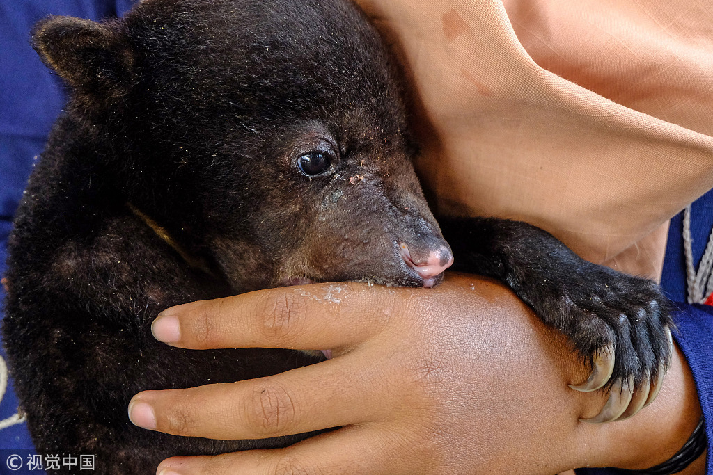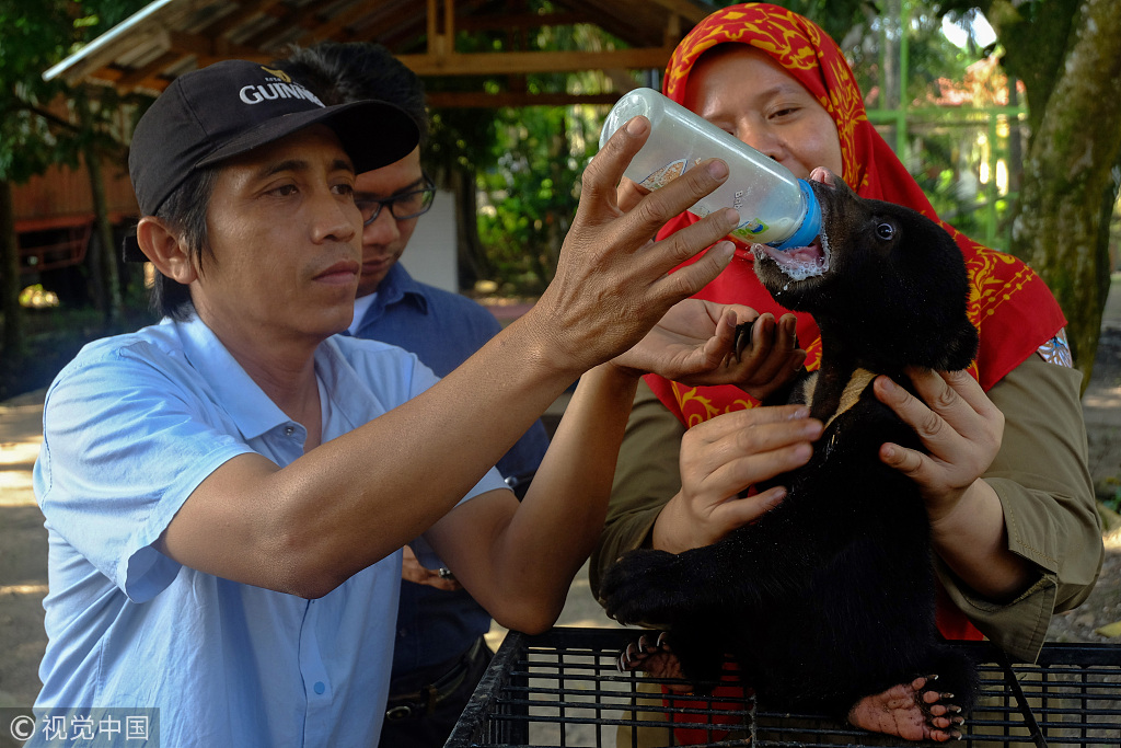 当地时间2018年10月9日,印度尼西亚廖内省,印度尼西亚自然资源保护中心(BBKSDA)一家过境诊所照料一只太阳熊宝宝(马来熊宝宝)。印度尼西亚自然资源保护中心负责照顾与母子分离的太阳熊幼崽,因为野生动物的原始栖息地逐渐变成了工业种植园和油棕榈种植园。