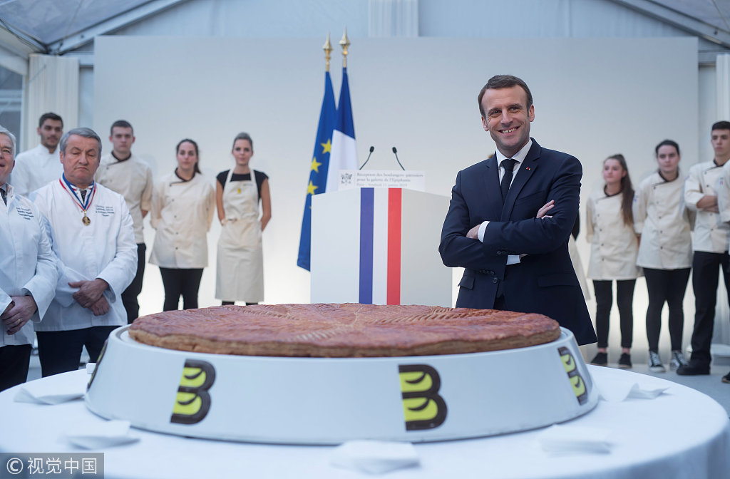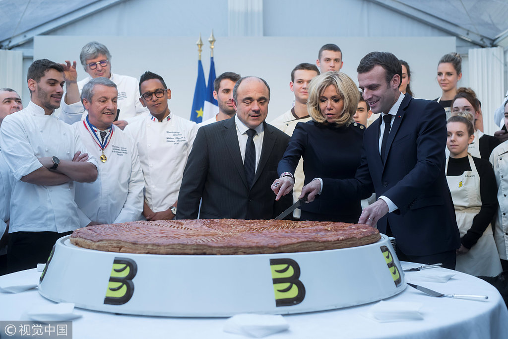 当地时间2019年1月11日,法国巴黎,法国总统马克龙偕“第一夫人”布丽吉特在爱丽舍宫出席主显节切蛋糕仪式。
