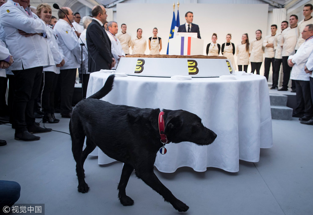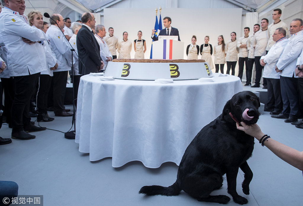 马克龙夫妇出席主显节切蛋糕仪式 遭小狗花式抢镜
