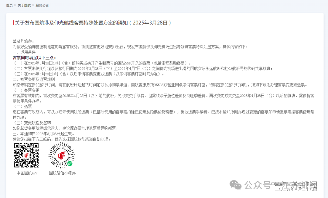 涉及缅甸航线的相关航班,在符合条件的情况下,可以免费进行退改签。机票适用范围、变更、退票及签转等相关信息,旅客可以查询各家航空公司官网了解。通过航空公司官方网站、app、服务热线和原购票渠道均可办理相关手续。