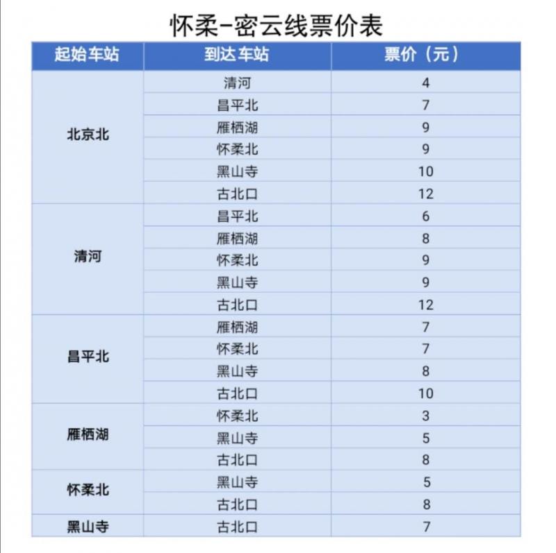 9月29日,市郊铁路工作专班公布了怀密线票价和列车时刻。怀密线采用与城市轨道交通一致的票制票价,北京北站至古北口站全程票价仅12元,北京北站至雁栖湖站票价9元,北京北站至昌平北站票价7元。