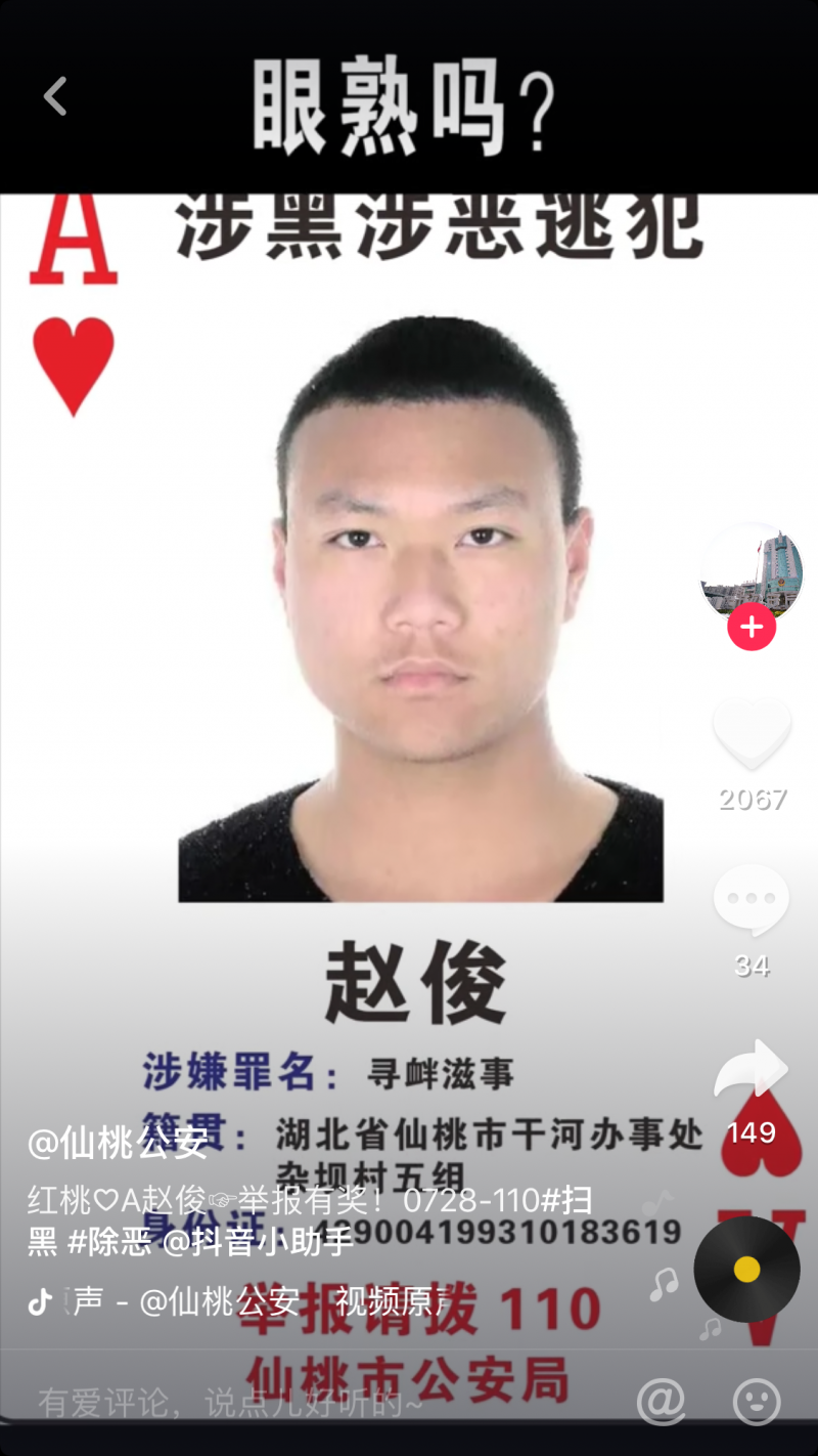 背景音乐是由远及近的警笛声,点开即是一张红心扑克牌,上面印有嫌疑人的照片、姓名、涉嫌罪名、籍贯和身份证信息。随着视频的播放,字幕出现“眼熟吗”“再看一遍”“莫怕黑恶势力,积极检举揭发”等字样。这样一条简单粗暴的“追逃”短视频,连日来在网上走红。