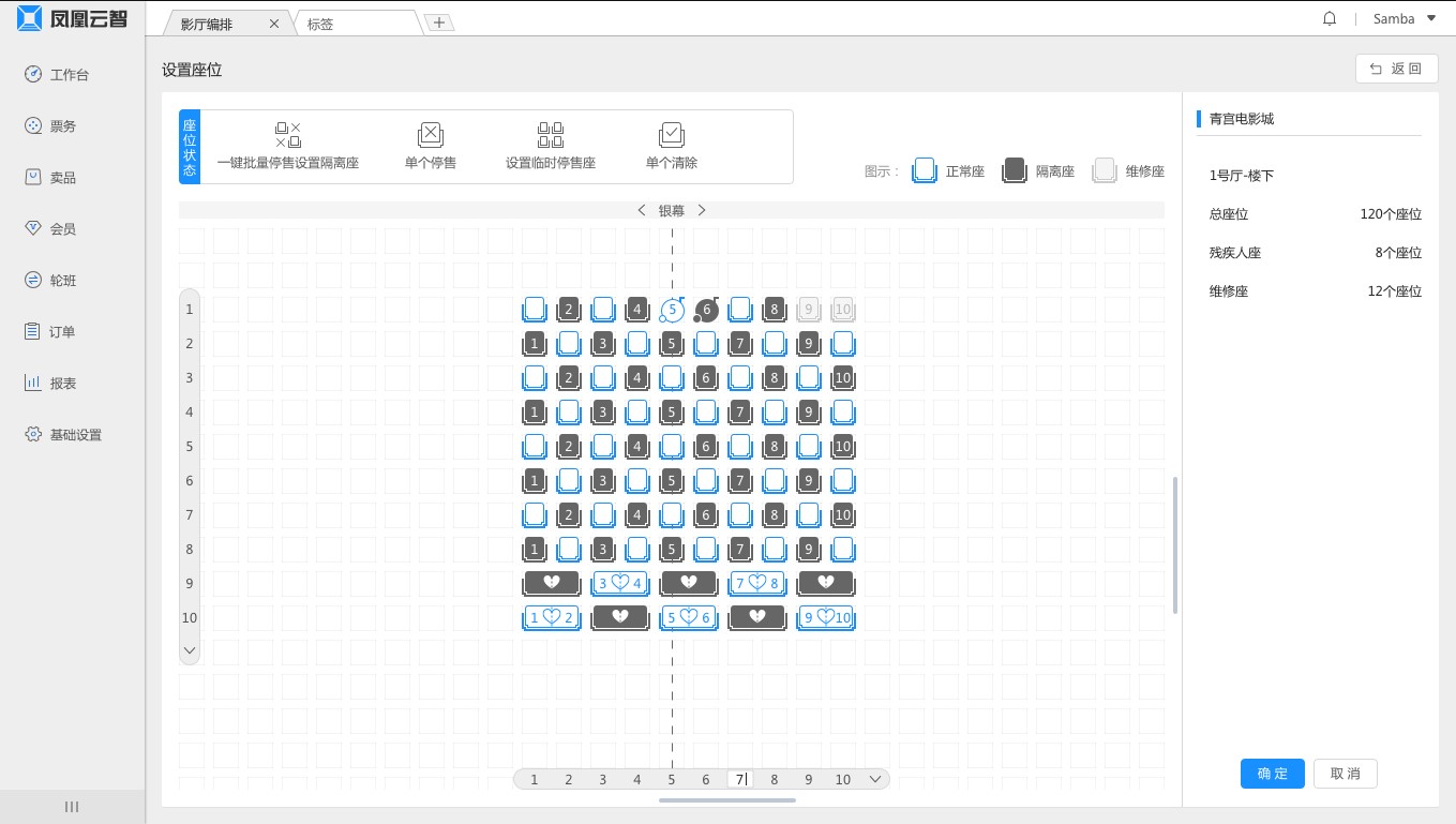 在此背景下,凤凰云智开发出“一键设置隔座售票”功能,目前已在全国各大影院端的凤凰云智系统上线。在系统操作页面上,影院管理者通过一键设置,即可以快捷地将售票系统改为隔座售票的模式。该功能免去了逐个关闭座位的调整流程,大大提升了影院管理效率。