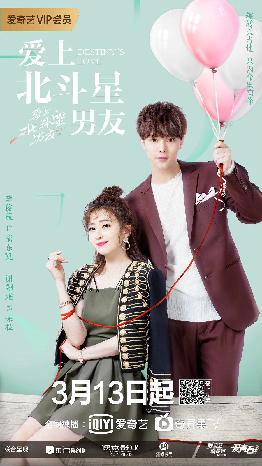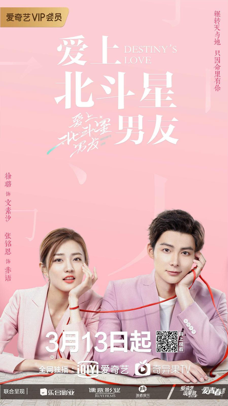 由爱奇艺出品,北京乐合,上海儒意,北京瑞格联合出品,林宏杰、陶声执导,陈祉希监制,徐璐、张铭恩、任言恺、吴昕主演的奇妙甜爱剧《爱上北斗星男友》宣布定档,将于3月13日晚20:00起爱奇艺全网独播,每周三至周五各更新2集,VIP会员抢先看6集。定档同时发布了一组“红绳”海报,剧中4组CP甜蜜初现,海报中他们身上都被一根延伸的红线环绕牵连,有缘分多是前定,红绳暗中牵系之意,也隐藏着背后错综复杂的感情纠葛。