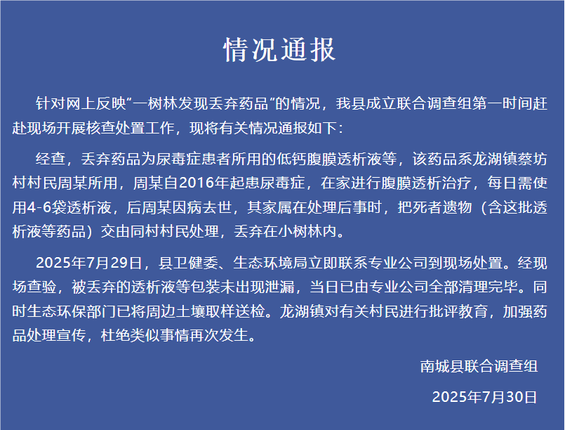 江西南城通报“一树林发现丢弃药品”:被丢弃的透析液等包装未出现泄漏